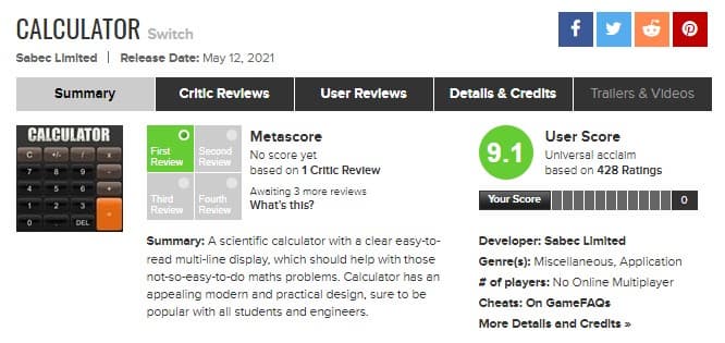 Калькулятор с названием Calculator для Nintendo Switch за 809 рублей спустя несколько недель после релиза вызвал у игроков большой интерес. Пользователи в забавной манере массово публикуют положительные отзывы о продукте на Metacritic.