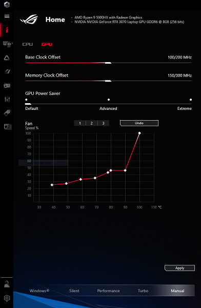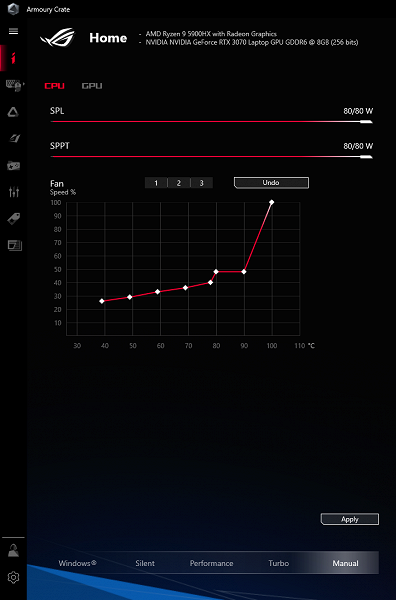 В Armoury Crate доступны три главных профиля: Silent, Performance и Turbo. В череде от первого к третьему возрастают как производительность, так и шум, вызываемый работой кулеров. В дополнение к ним профиль Windows передает управление параметрами быстродействия и энергосбережения операционной системе, а Manual дает возможность использовать ручные настройки.
