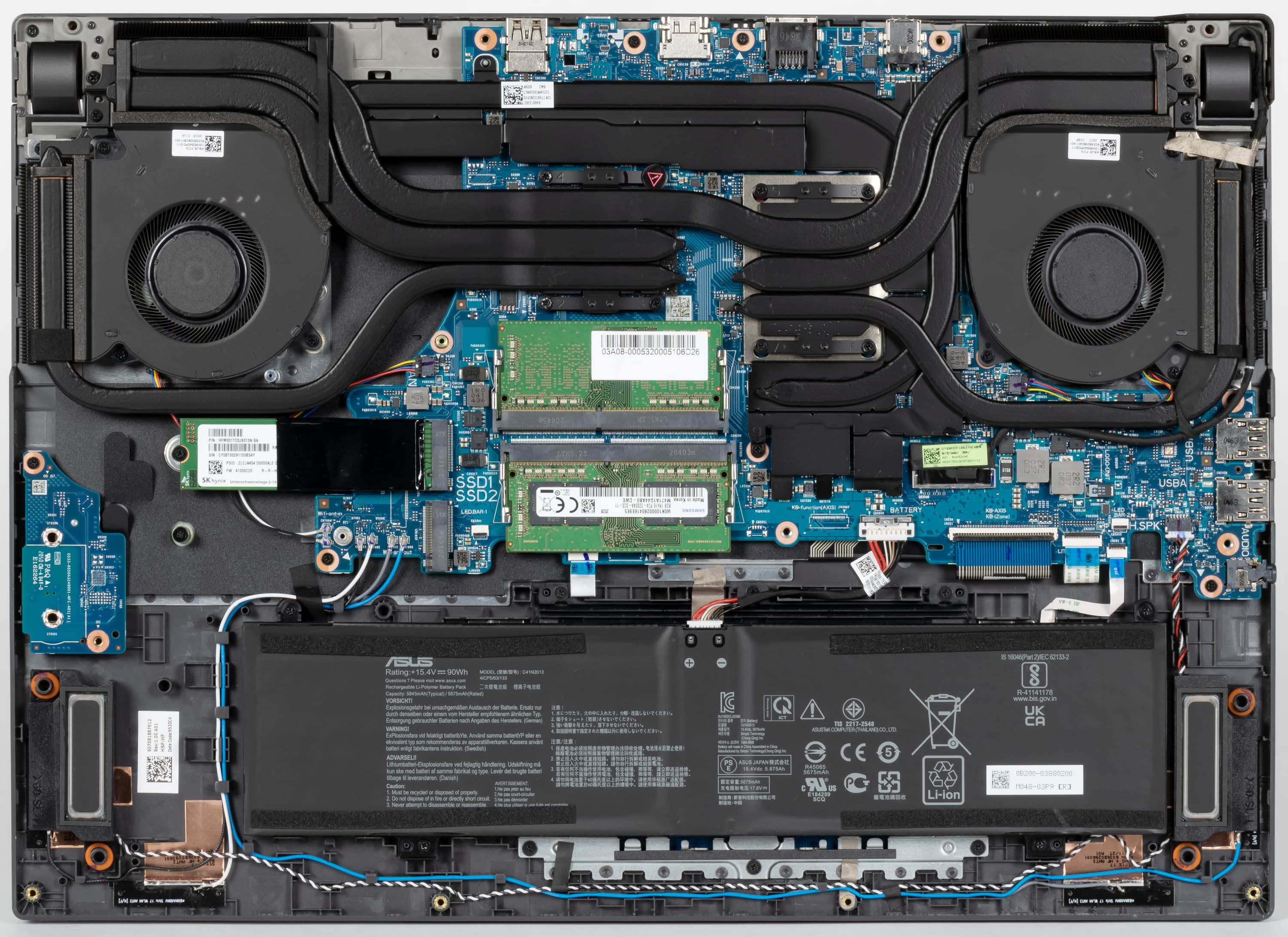 Под системой охлаждения видны два модуля памяти SO-DIMM по 8 ГБ, SSD-накопитель емкостью 1 ТБ, свободный слот для второго аналогичного накопителя, динамики, а также массивная литий-полимерная батарея (90 Вт·ч). Отметим, что благодаря ей ней ноутбук способен довольно долго работать от батареи: