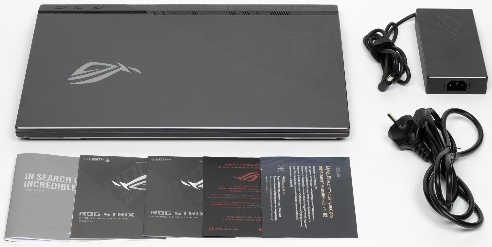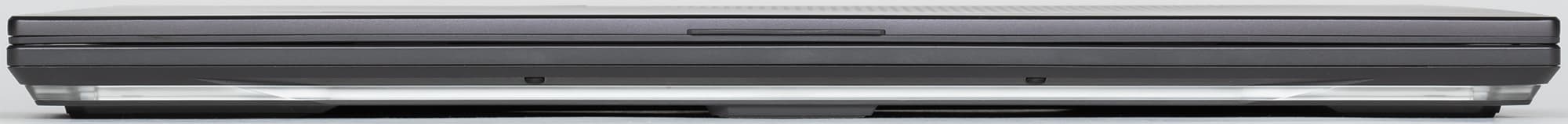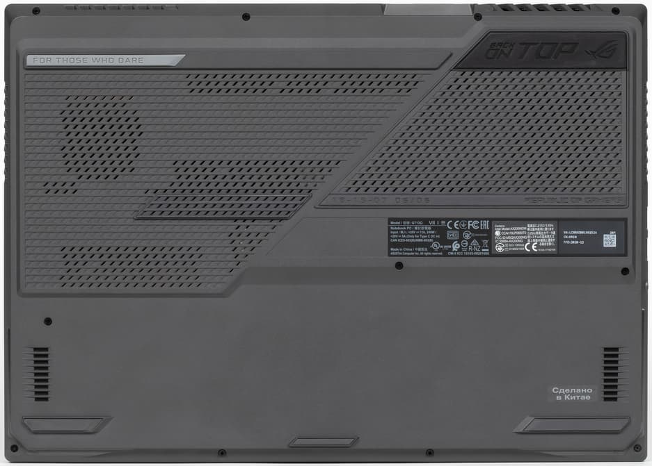 Крышка металлическая, черная, матовая, с зеркальным логотипом ROG, который при работе заполняется неярким белым светом. Нижний угол крышки заполнен буквами этой аббревиатуры, нанесенными, вероятно, методом лазерной гравировки. Они почти неразличимы невооруженным глазом и кажутся просто мелкими квадратиками.