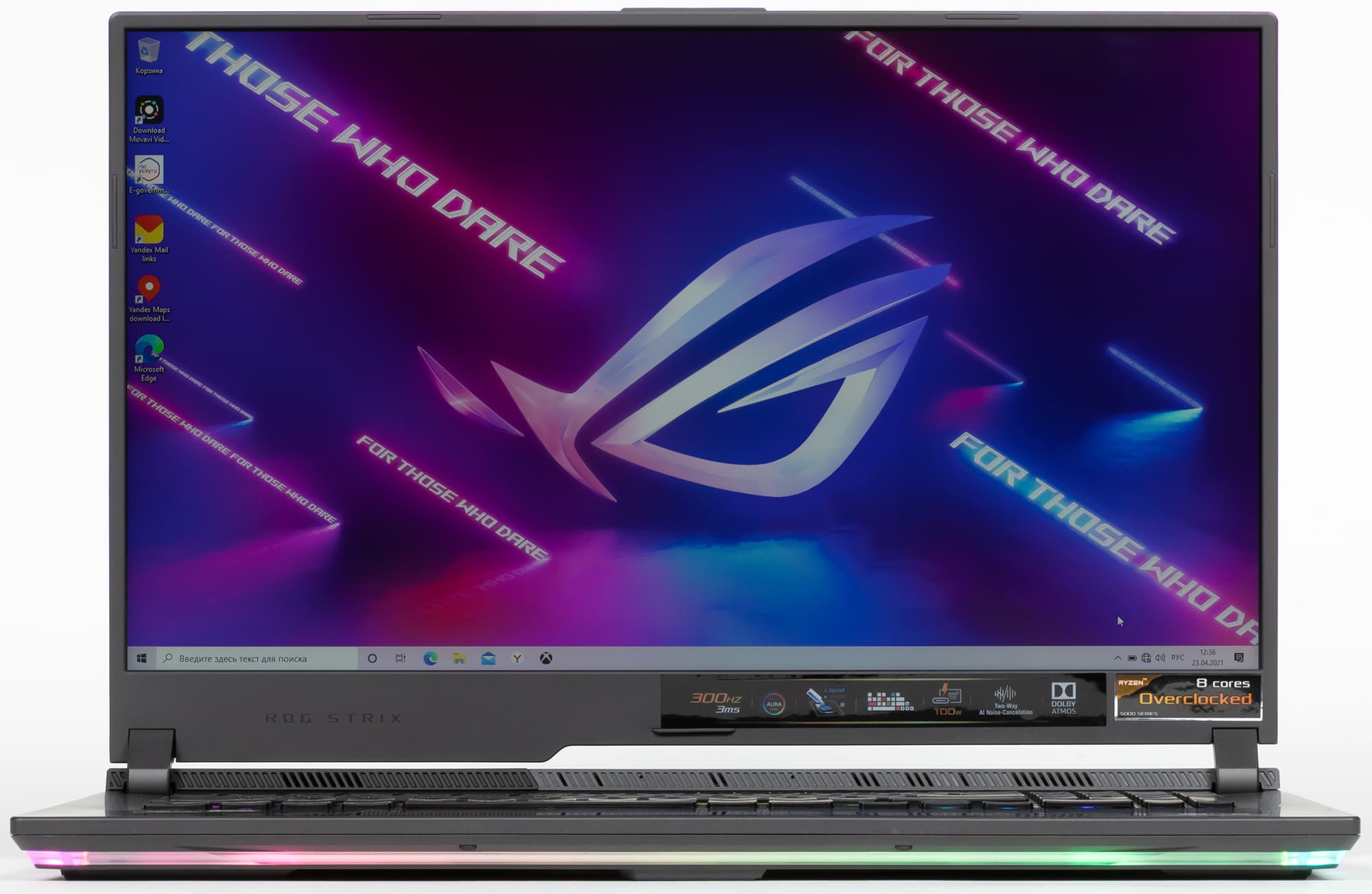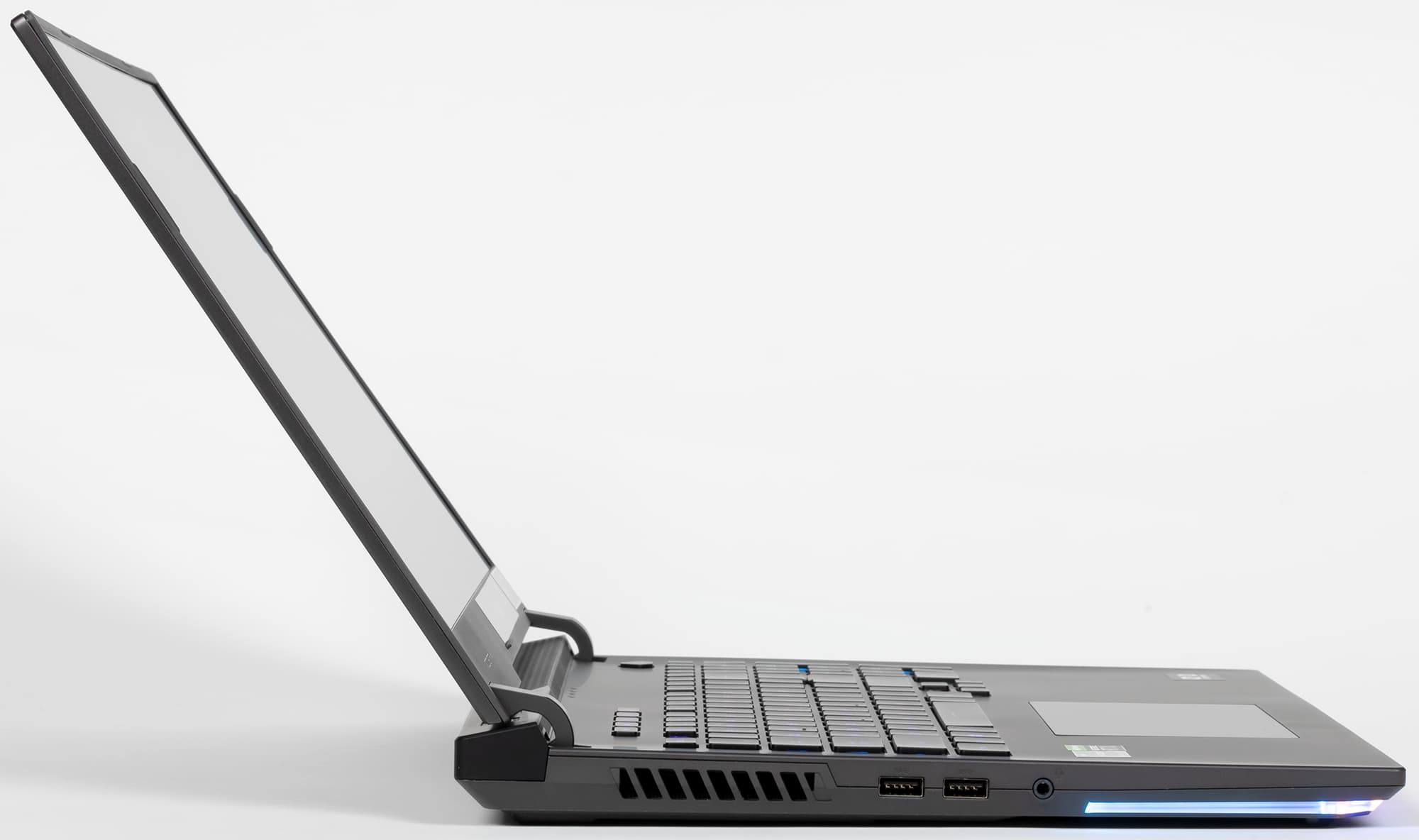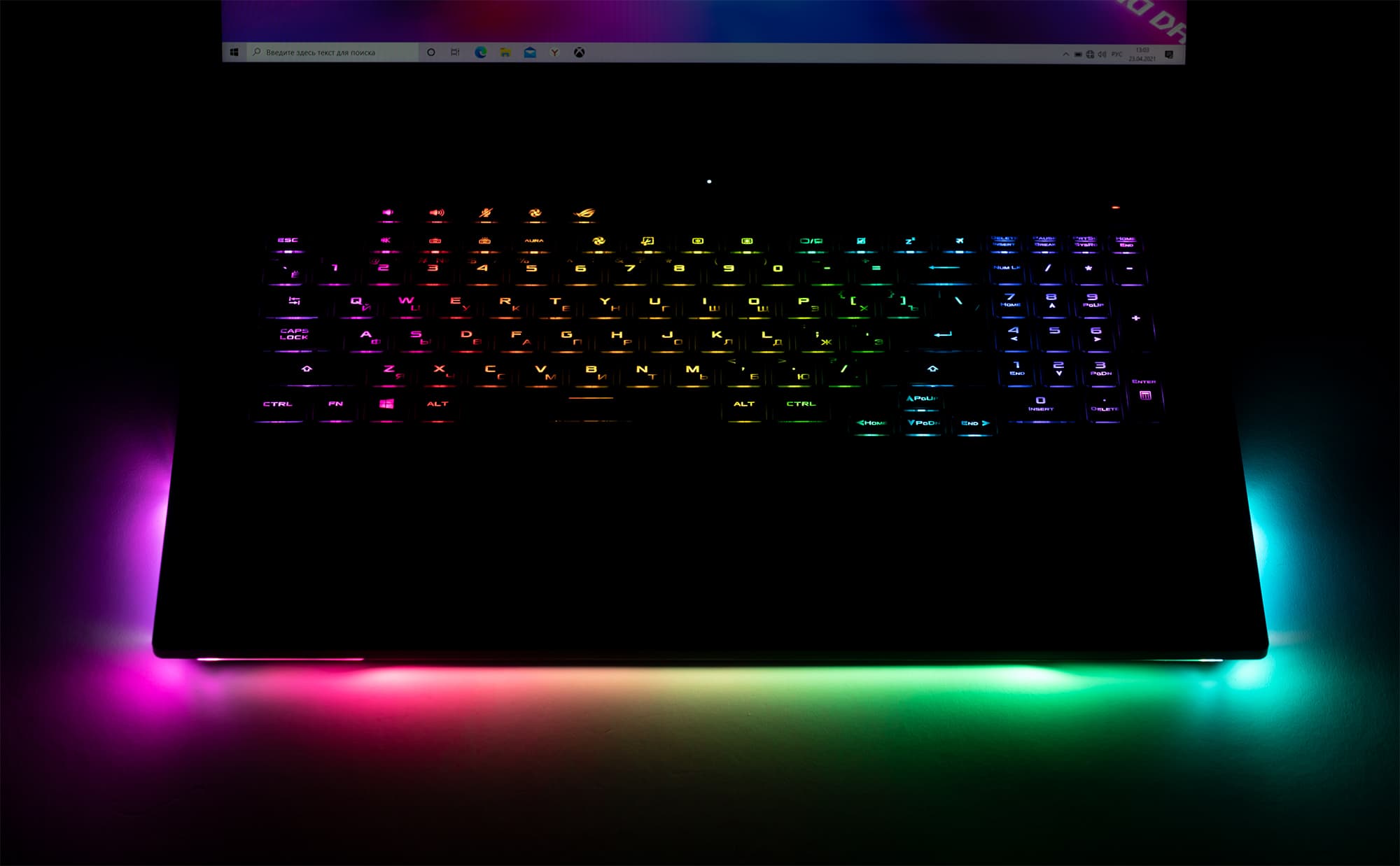 С трех сторон подсвечивается корпус ноутбука и поверхность, на которой он располагается. Это реализовано благодаря пластмассовой световодной вставке спереди и по бокам. Режим подсветки соответствует профилям Aura для клавиатуры (вызов аккордом Fn+F4):