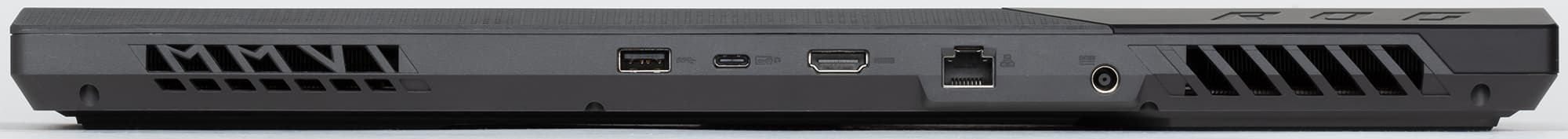 На задней боковой панели по краям разместились два выходных отверстия системы охлаждения, третий разъем USB-A 3.2, разъем USB-С 3.2, видеовыход HDMI, коннектор гигабитного сетевого интерфейса RJ-45 и гнездо для подключения адаптера питания.