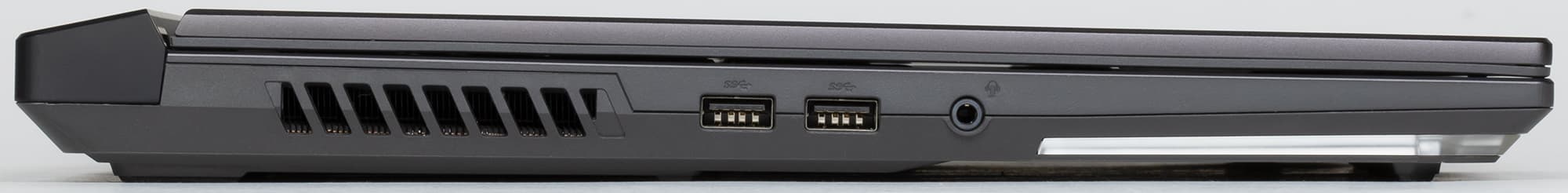 На левой боковой панели помещены решетка выходного отверстия системы охлаждения, два разъема USB-A 3.2, стандартный мини-джек 3,5 мм для подключения наушников или аудиогарнитуры, а также световод подсветки.