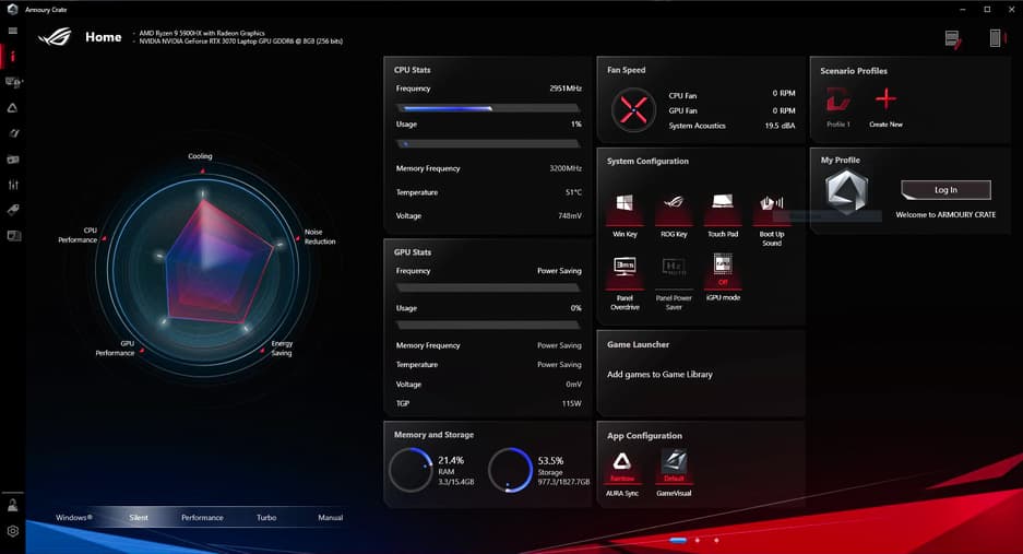 Фирменное приложение Armoury Crate позволяет переключать профили настроек, которые задают разные соотношения между следующими параметрами:
