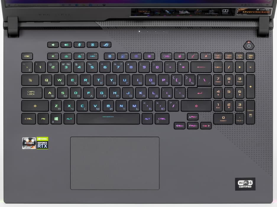 Клавиатура мембранного типа характеризуется достаточным вертикальным ходом кнопок (1,9 мм). Она снабжена подсветкой, цвета и характер которой можно изменять согласно предпочтениям пользователя, причем, для каждой отдельно взятой клавиши (per key RGB). Настройка производится в фирменном приложении Armoury Crate, быстрый доступ к которому осуществляется нажатием первой справа кнопки в самом верхнем ряду клавиатуры с нанесенным на нее логотипом ROG.