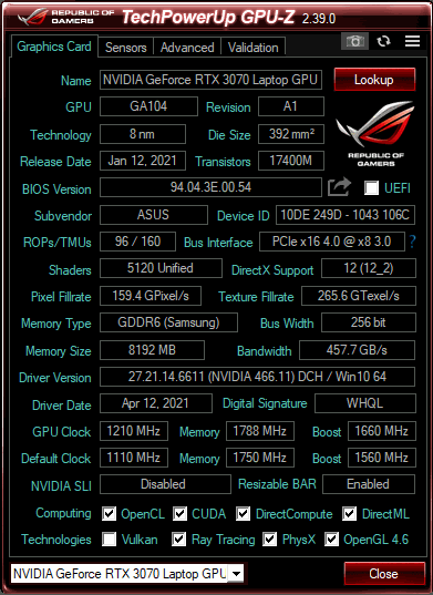 Видеокарта Nvidia GeForce RTX 3070 (архитектура Ampere) —одно из самых производительных мобильных решений на сегодняшний день. По мощности она уступает лишь абсолютному лидеру Nvidia GeForce RTX 3080. В ноутбуке видокарта располагает 16 ГБ памяти GDDR6 с 256-битной шииной (пропускная способность 458 ГБ/с) и работает с максимальным потреблением 130 Вт.
