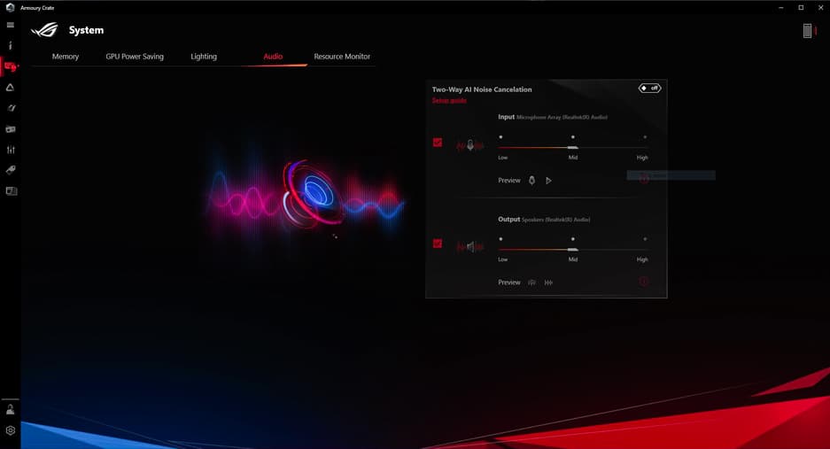 В фирменном приложении Armoury Crate есть также возможность настройки интеллектуальной системы шумоподавления (раздельно для аудиовыхода и микрофонного входа).