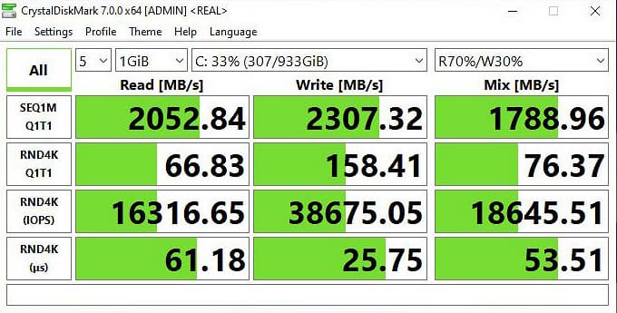SSD-накопитель демонстрирует весьма высокие скорости работы, не только недостижимые для шпиндельного жесткого диска, но и примечательные для устройств с интерфейсом М.2.