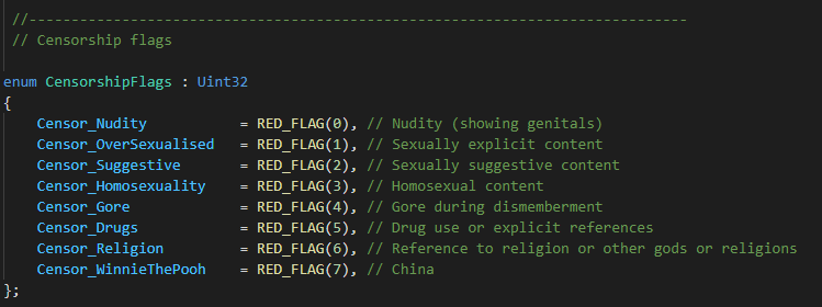 Настройка цензуры для Китая обозначена как «Censor_WinnieThePooh». С Винни-Пухом иногда сравнивают главу компартии Китая Си Цзиньпина.
