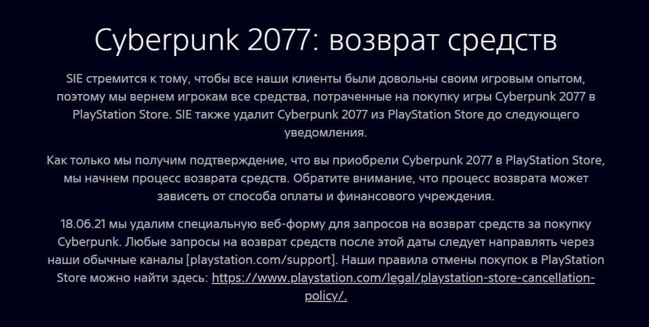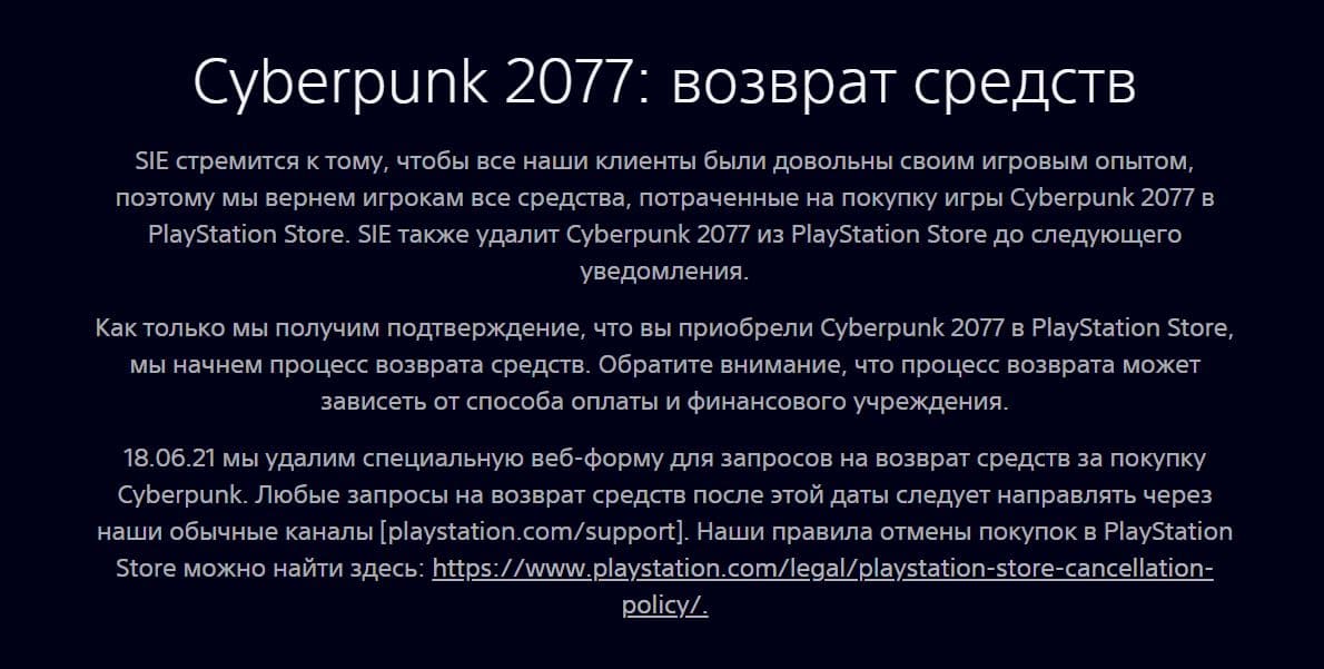 Веб-форма возврата средств в упрощенном порядке появилась 18 декабря, когда Cyberpunk 2077 была снята с продажи в PS Store. Когда именно SIE вернет Cyberpunk 2077 на цифровые прилавки неизвестно. CD Projekt в свою очередь ведет переговоры с компанией по этому поводу.