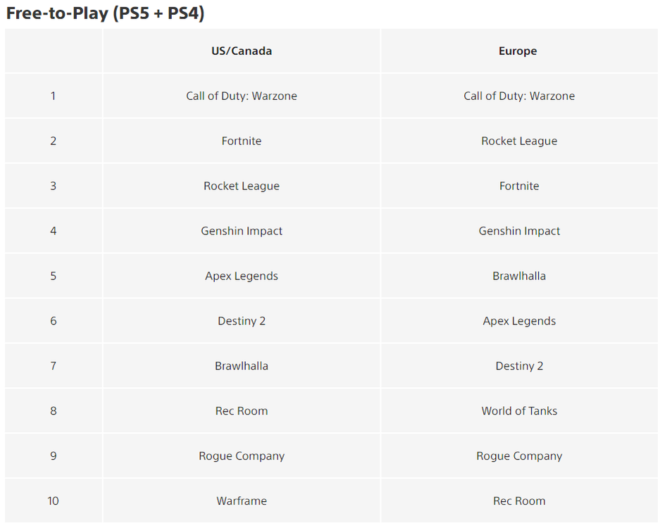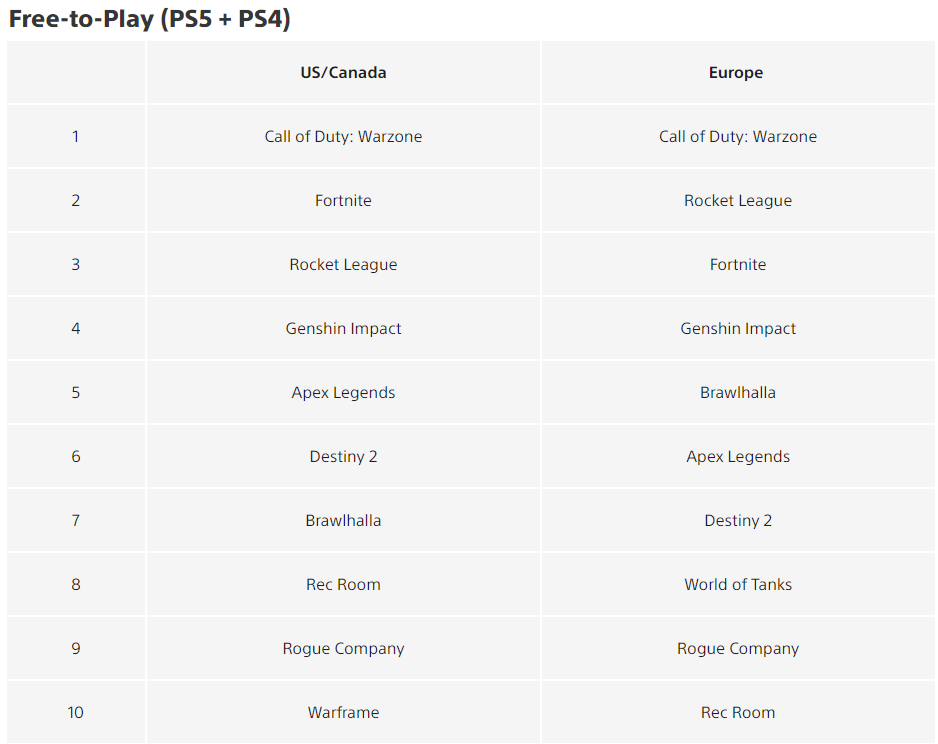 Военный шутер Enlisted который издаёт Gaijin Entertainment, выпал из десятки самых скачиваемых условно-бесплатных проектов. Королевская битва Warzone сохранила лидерство. Fortnite и Rocket League также сохранили свои позиции. Боевая ролевая игра Genshin Impact подбирается к тройке лидеров. В апреле она занимала 7 и 6 местов в США/Канаде и Европе соответственно.