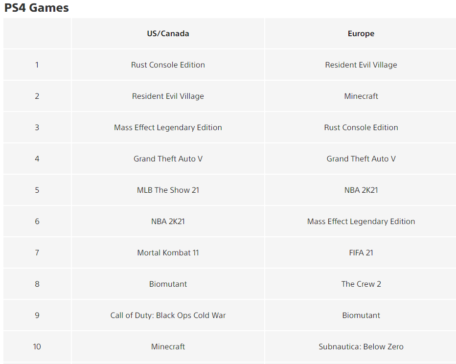 На PS4 Village сохранила лидерство в Европе, но опустилась на второе место в США/Канаде уступив симулятору выживания Rust Console Edition.