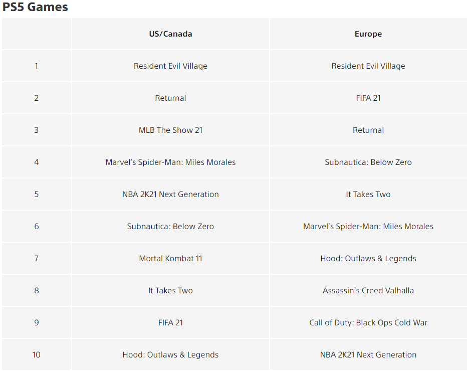 Под стать высокой вампирше Димитреску, вышедший 7 мая боевой хоррор Resident Evil Village возвысился над остальными. Игра стала самой скачиваемой в мае в Европе и США/Канаде на консоли PS5.