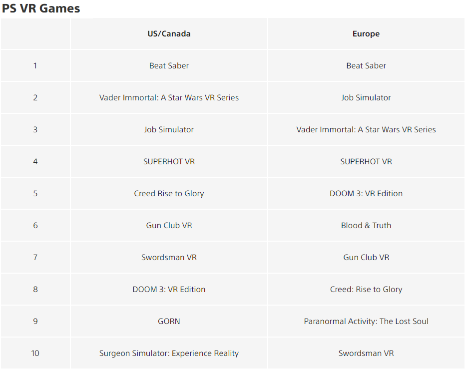 В VR-сегменте по-прежнему лидирует музыкальная ритм-игра Beat Saber, которая вышла в 2018 году. Job Simulator сохранила апрельские позиции. В списке появилась Vader Immortal. Недавно Sony поделилась информацией о 7 проектах для VR-устройства.