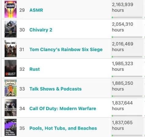 Просмотры говорят сами за себя. Категория «ASMR» набрала 2,1 миллиона часов просмотров за последние 7 дней, в то время как в «Hot Tubs» зафиксировано 1,8 миллиона.