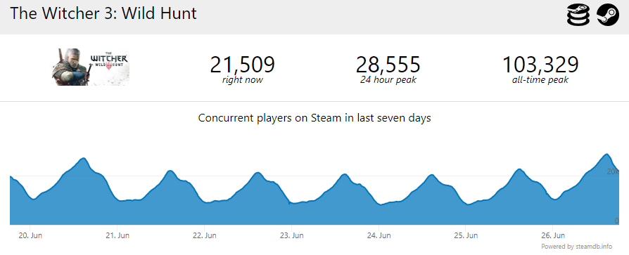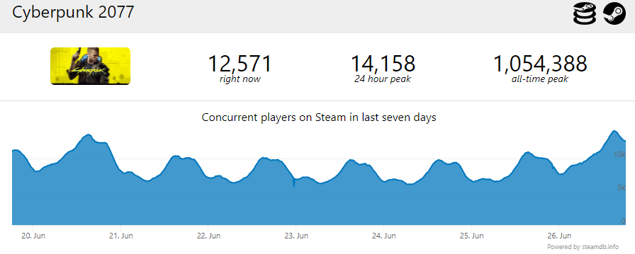 Согласно статистике сервиса SteamDB, на пике зарегистрировано более 1 миллиона игроков. На данный момент рекорд за сутки всего 14 158 человек, что примерно составляет ~1.4%. Таким образом, проект потерял порядка 99% аудитории. Напомним, что игра доступна и на других платформах. Однако, CD Projekt не называет число проданных копий.