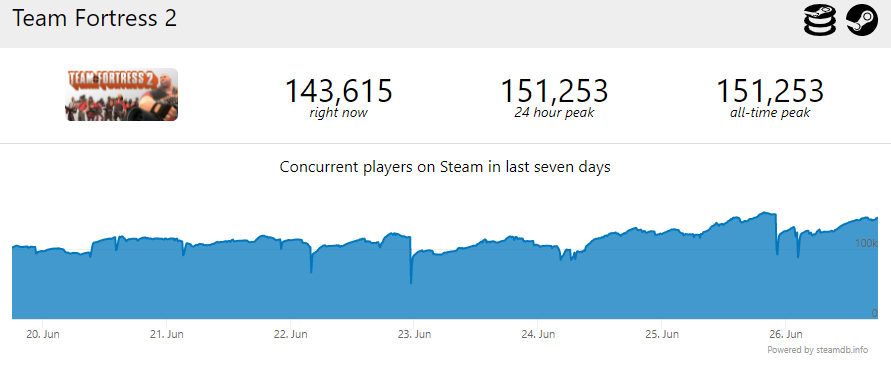 Вышедший в 2007 командный сетевой шутер Team Fortress 2 продолжает привлекать игроков. Во время летней распродажи установлен исторический рекорд по пиковому онлайну.