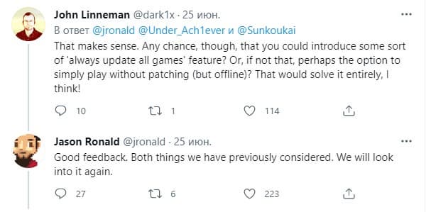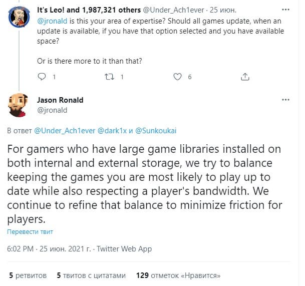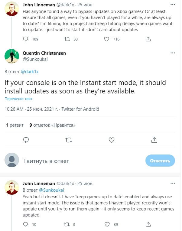 Ему ответил менеджер проектов Джейсон Рональд, который заявил, что Microsoft пытается найти баланс в отношении обновлений. Сотрудник Eurogamer оценил усилия корпорации, предложил ввести опцию «всегда обновлять все игры» или сделать доступной функцию автономной игры (без патчей). Представитель Microsoft подтвердил, что сотрудники ещё раз изучат проблему.
