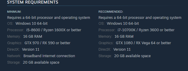 После обновления требований, «минимальными» видеокартами стали RX 5600 XT и GTX 1070. В тоже время рекомендуют уже RX 5700 XT или RTX 2060 Super.