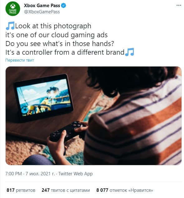 Microsoft при продвижении своих услуг играет с формами и мыслями. На текущей неделе гигант выпустил песню All-4-One, которая нестандартно и с юмором продвигает Xbox All Access, а теперь использовал контроллер конкурента в рекламе Cloud Gaming.