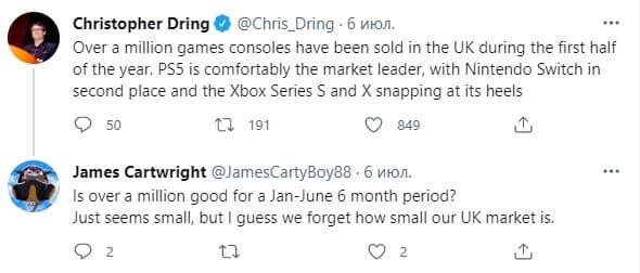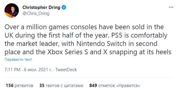 Кристофер Дринг, главный редактор GamesIndustry.biz, который систематически делится данными по британскому рынку, подтвердил, что в первой половине 2021 года в Великобритании было продано более 1 миллиона консолей и что PS5 является «явным лидером рынка». На втором месте Nintendo Switch, но Xbox Series X|S «наступает на пятки» большой «N».