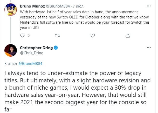 По оценкам Дринга, к концу 2021 года мы станем свидетелями падения продаж консолей Nintendo примерно на 30% в годовом исчислении, но, несмотря на изменения, это будет второй лучший результат Switch в истории. В прошлом году был беспрецедентный показатель из-за пандемии и премьеры новых игр ключевых интеллектуальных собственностей компании.