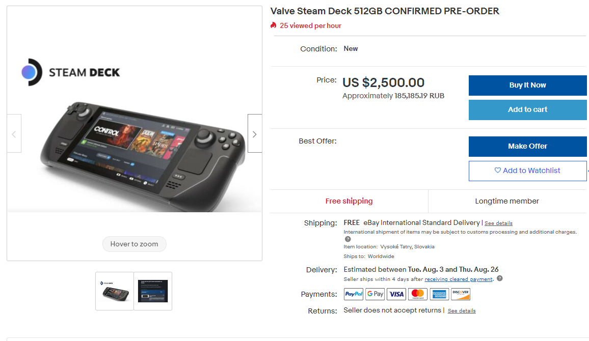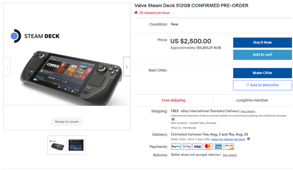 Самая дорогая версия Steam Deck на 512 ГБ за 649 долларов (~48 тысяч рублей) доступна на eBay всего за 185 тыс. руб. Есть и предложения по 70-100 тыс. руб.