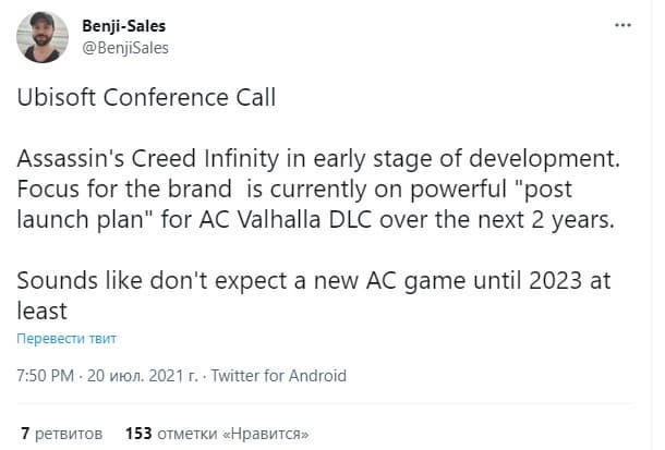 «Что касается проекта под кодовым названием Infinity, у нас есть захватывающие планы на будущее, которые могут значительно расширить охват бренда, оставаясь верными наследию Assassin's Creeds, основанному на богатых сюжетных событиях. Он находится на ранней стадии разработки, и мы в своё время поделимся более подробной информацией».