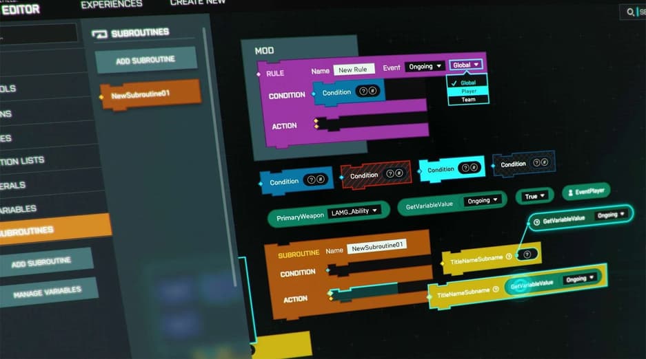 Battlefield Portal поможет создать многопользовательскую игру на своих условиях. В руки игроков попадёт песочница, позволяющая изменять не только настройки, но и логику игры (на основе скриптов), представленную блоками.