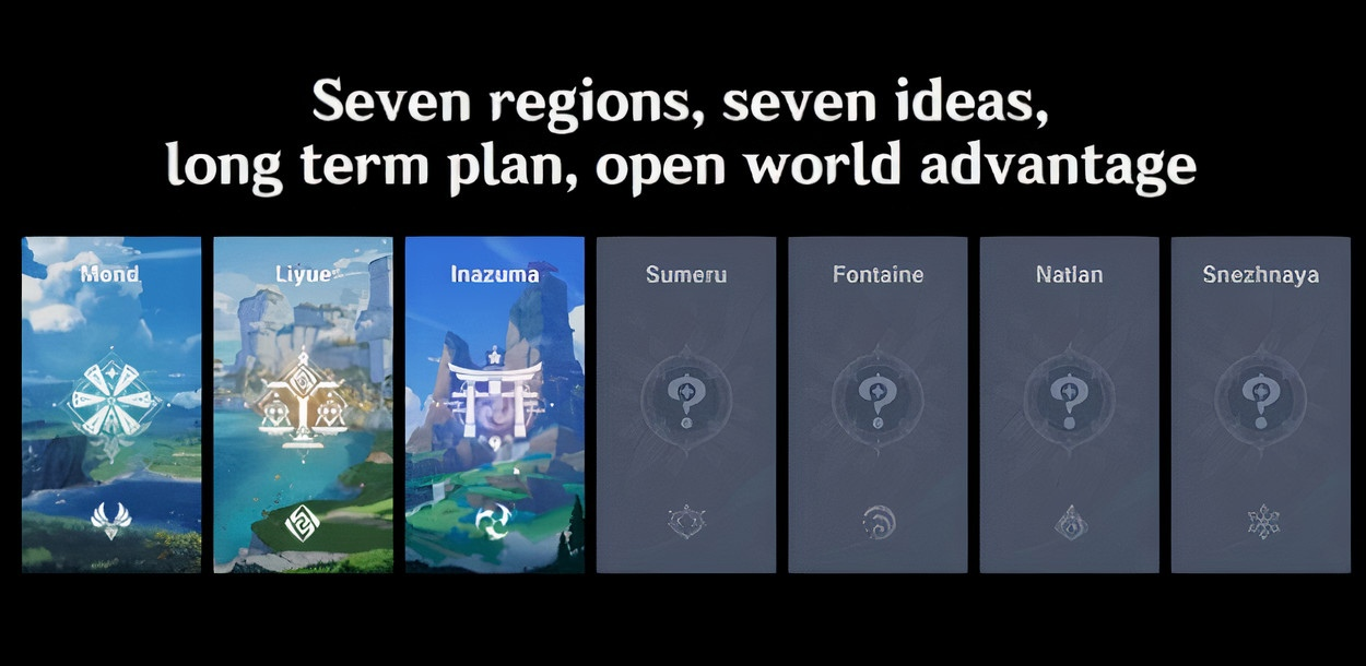 На добавление 4 регионов: Sumeru (Сумеру), Fontaine (Фонтейн), Natlan (Натлан), Snezhnaya (Снежная), разработчикам потребуется около 4 лет. Каждый новый регион будет обладать собственной тематикой. Концепты каждого уже были созданы на ранних этапах разработки Genshin Impact.