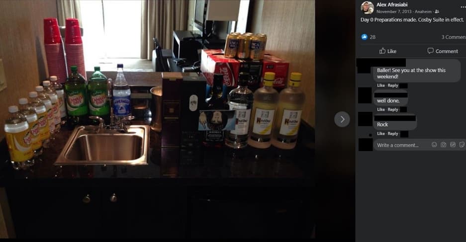 Афрасиаби и Cosby Suite указаны в иске, поданном штатом Калифорния против Activision Blizzard, где утверждается, что разработчик World of Warcraft придерживался «культуры братишек». В иске говорится, что о домогательствах Афрасиаби к женщинам было настолько хорошо известны, что номер отеля получил название «Люкс Косби» в честь насильника Билла Косби.