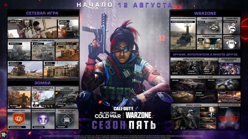 Уже 12 августа на ПК и консолях двух поколений стартует пятый сезон в Black Ops Cold War и королевской битве Warzone. Игроки получат еще сто уровней боевого пропуска со шмотками для оперативников, раскрасками и побрякушками для оружия, а также новые игровые режимы для соревновательного и кооперативного мультиплеера.