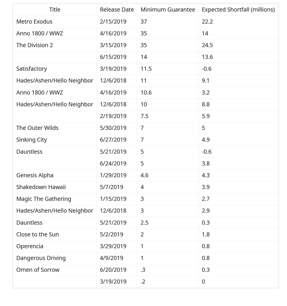 [Minimum Guarantee — минимальная гарантия (сумма, которую выплатит Epic вне зависимости от того заработает ли игра деньги); в миллионах долларов]