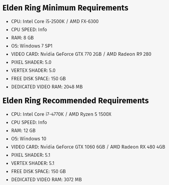 На прошлой неделе Elden Ring появилась в Steam и других магазинах. Обнаружено, что игру переведут на русский язык. Теперь редакторы Game Informer представили системные требования к игре, которые пока официально не подтверждены From Software и не опубликованы в Steam,