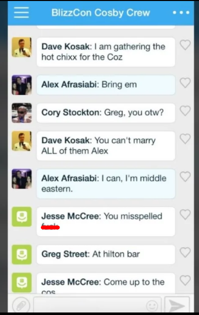 Ковыряясь в чужом «грязном белье», Kotaku выкопал переписку между сотрудниками компании. Бывший дизайнер Дэвид Косак написал, что «собирает горячих цыпочек» в скандально известном «Номере Косби» Алекса Афрасиаби, а затем пошутил, что Афрасиаби не сможет на них всех жениться, на что МакКри ответил: «ты допустил опечатку в слове вы***ь».