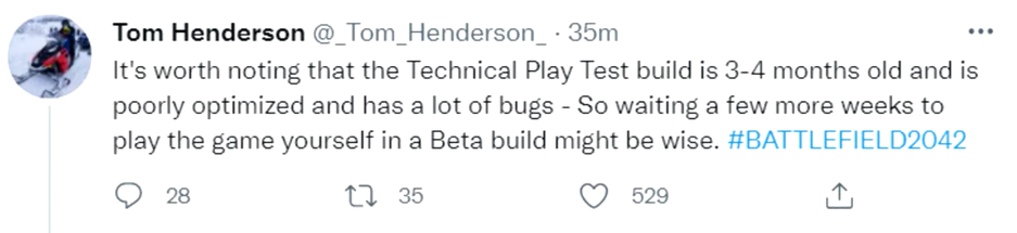 Идёт техническое тестирование. Инсайдер Том Хендерсон предупредил, что представлен билд игры 3-4-месячной давности и он плохо оптимизирован, с багами. Том рекомендует подождать и сыграть уже в бета-билд игры.