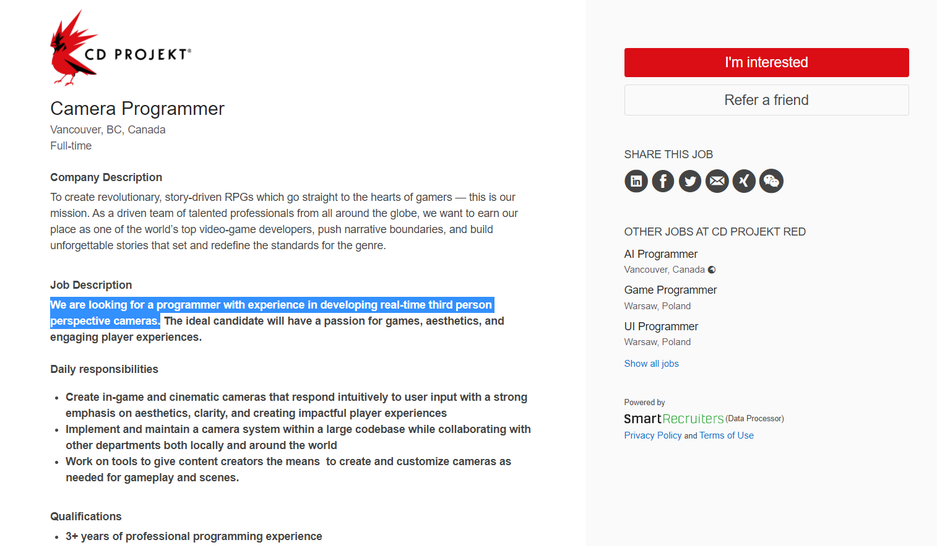 Пользователи обратили внимание, что CD Projekt потребовались новые специалисты. В частности, им необходим программист с опытом работы (с камерой) над проектами, в которых действие происходит в реальном времени и с видом от третьего лица.