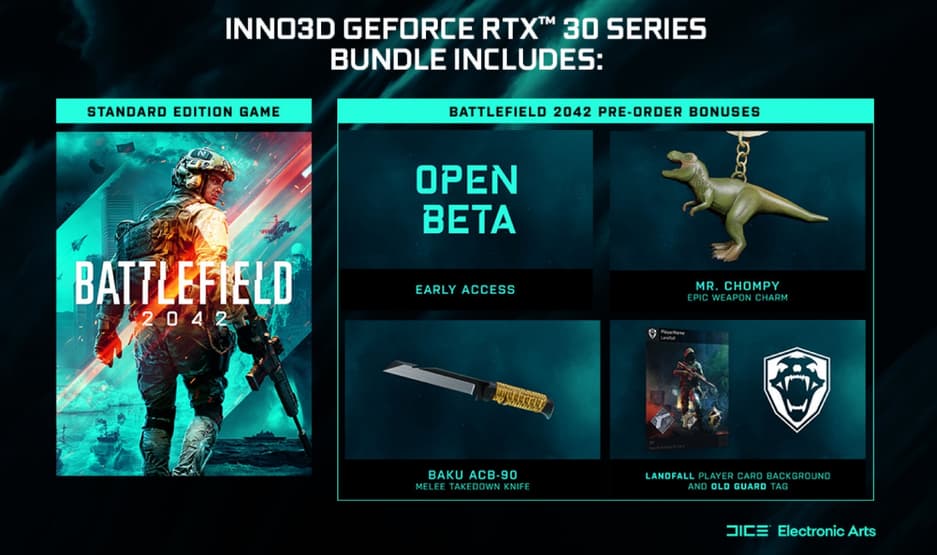 INNO3D намерена укомплектовывать каждую видеокарту GeForce RTX 3070, GeForce RTX 3070 Ti, GeForce RTX 3080, GeForce RTX 3080 Ti и GeForce RTX 3090 кодом на загрузку стандартного издания Battlefield 2042, который также дает доступ к ранней бете и различным бонусам за предварительный заказ вроде брелока Мистера Чомпи и тактического боевого ножа Baku ACB-90.