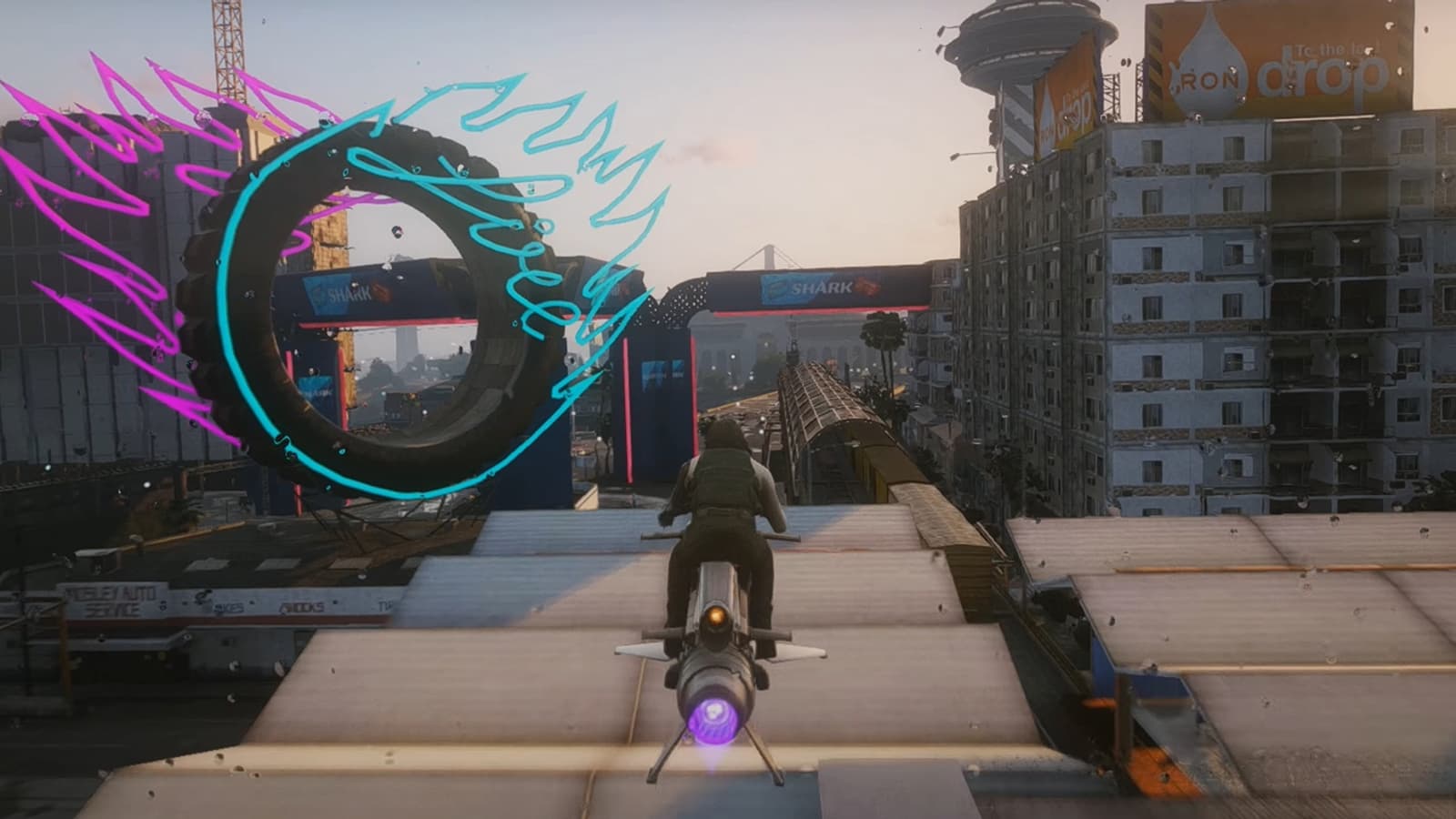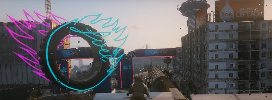 В ролике автор катается на разнообразном транспорте по городу из ролевой игры Cyberpunk 2077 прямо в GTA 5.