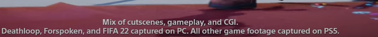 В ролике указано, что используются кат-сцены, кадры игрового процесса и CGI. Все кадры из игр записаны на PS5, исключение: FIFA 22, Deathloop и Forspoken.