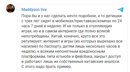 «Пора бы и у нас сделать нечто подобное, а то детишки с трех лет сидят в мобилках/приставках/компах по 24 часа 7 дней в неделю. И не только в отупляющих играх, но и в самом интернете где полно всякой непотребщины. Китай, конечно, круто все это регулирует: интернет и игры (из которых вырезано все насилие) по паспорту, детям лишь несколько часов в неделю, к всяким непонятным вредоносным платформам, типа ютьюба и фейсбука, закрыт доступ и работают лишь их собственные китайские аналоги. С этого надо брать пример»