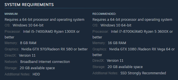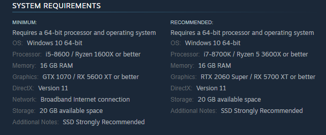 Во время альфа-тестирования разработчики уже меняли системные требования. Тогда «минимальными» вместо GTX 970 или RX 590 стали GTX 1070 или RX 5600 XT. Рекомендовали использовать вместо GTX 1080 или RX Vega 64 такие: RTX 2060 Super или RX 5700 XT.
