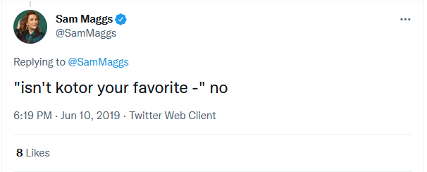 Что самое примечательное, Мэггс не любит Knights of the Old Republic, о чем она сама же и написала: