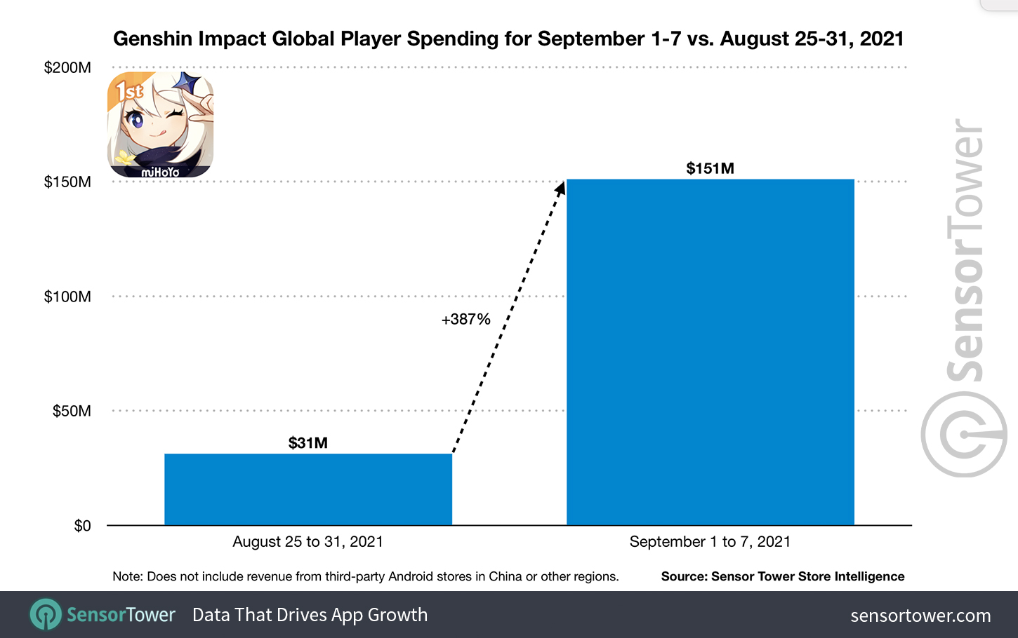 По данным Sensor Tower (Store Intelligence) за первую неделя сентября условно-бесплатная игра Genshin Impact принесла ~151 миллион долларов.