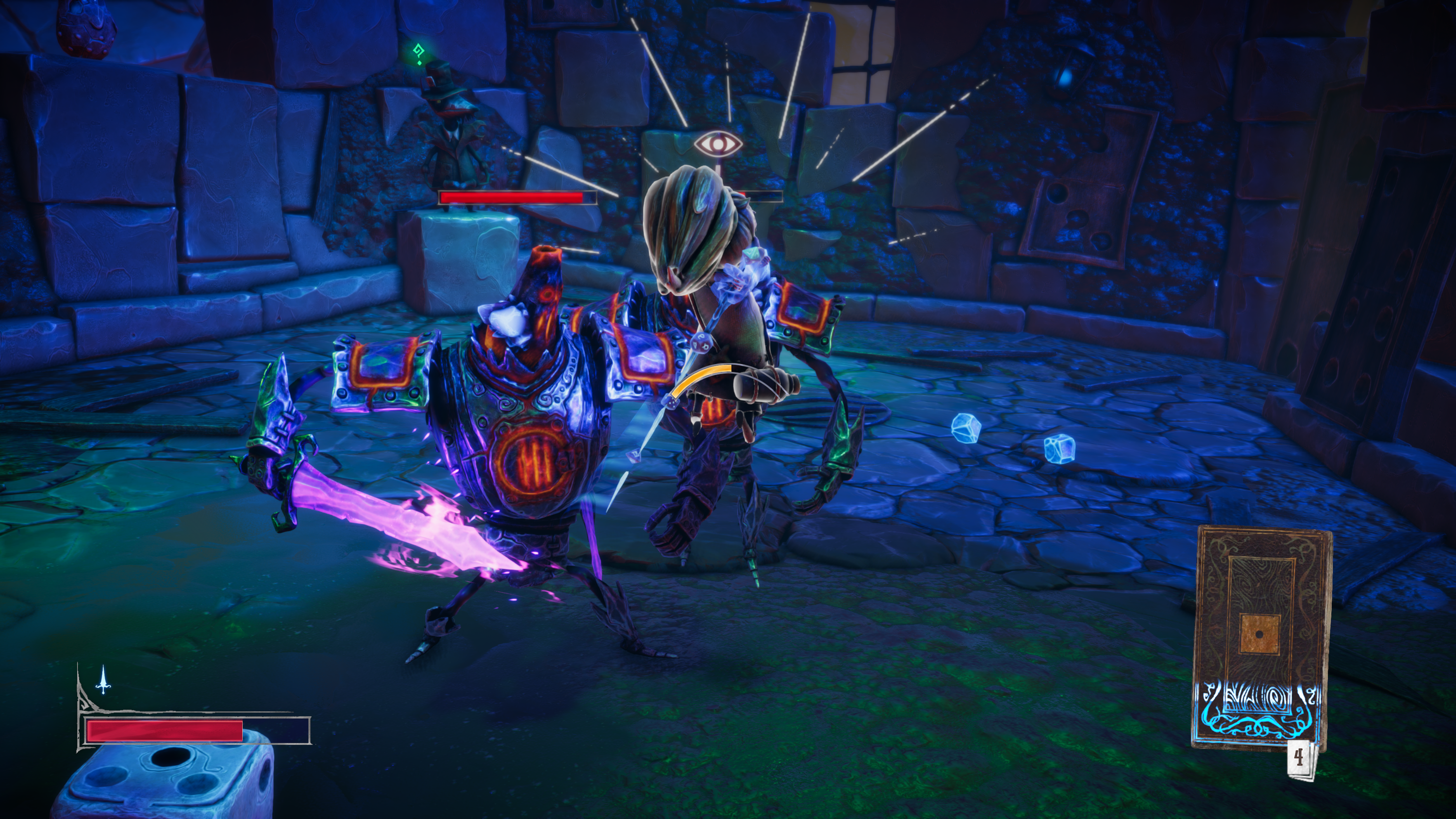 Всего в игре пять типов карт: оружие, урон, защита, препятствие и мухлеж. Какие-то карты вооружают Ивен мечом, огромной булавой или луком со стрелами, другие ослабляют противников или разбрасывают по аренам бомбы, третьи могут превратить Дайси в камикадзе с неплохим радиусом взрыва, четвертые дают временную неуязвимость. Возможностей много, как и пространства для стратегического мышления. Эффекты карт также легко совмещать: из колоды можно вытянуть замедление врагов, затем отправить к ним Дайси с бомбой.