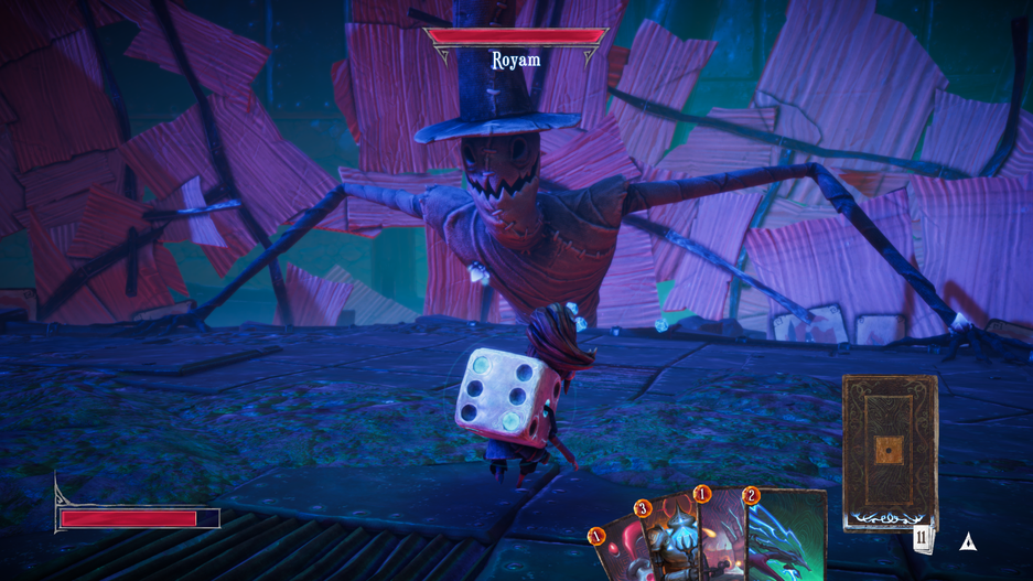 Битвы в Lost in Random — это важный элемент, совмещающий в себе карточную игру и тот самый пресловутый рандом. В отличие от других игр, где врагам нужно просто раздавать оплеухи при помощи подручных средств, в игре студии Zoink! все немного сложней. Ивен вооружена рогаткой, при помощи которой она может разбивать наросты в виде энергетических кристаллов на телах противников. Эта энергия питает Дайси, давая Ивен возможность бросить его, чтобы разыграть карты из своей колоды.