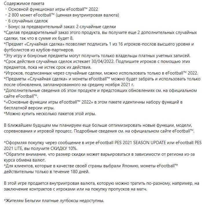 «В этом специальном выпуске пакета предоставляется доступ к основным (бесплатным) функциям игры и некоторым классным предметам, с помощью которых вы сможете создать в eFootball™ World свою креативную команду! Сформируйте команду, подписывая игроков и главных тренеров, и тренируйте их в соответствии со своим любимым игровым стилем».