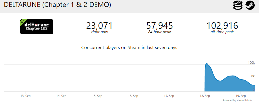 Согласно статистике сервиса SteamDB, пиковый онлайн в Deltarune достиг отметки в 102 916 игроков.