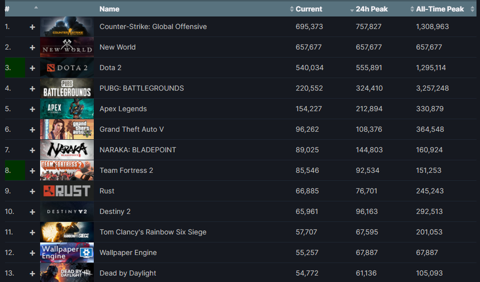 На момент публикации пиковый онлайн в платной игре New World достиг отметки в 657 677 игроков. Пиковый онлайн в условно-бесплатной игре Counter-Strike: Global Offensive составил 757 827 игроков.