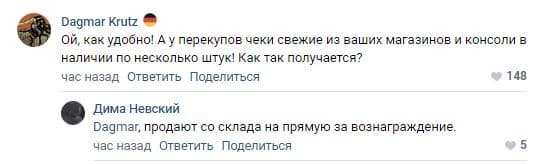 Пользователей такой ответ не устроил. Людям стало интересно, как тогда консоли со свежими чеками оказываются в руках у перекупщиков.
